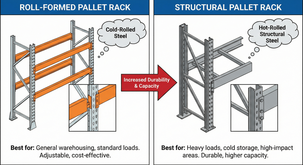 What is the main difference between roll formed and structural pallet rack?